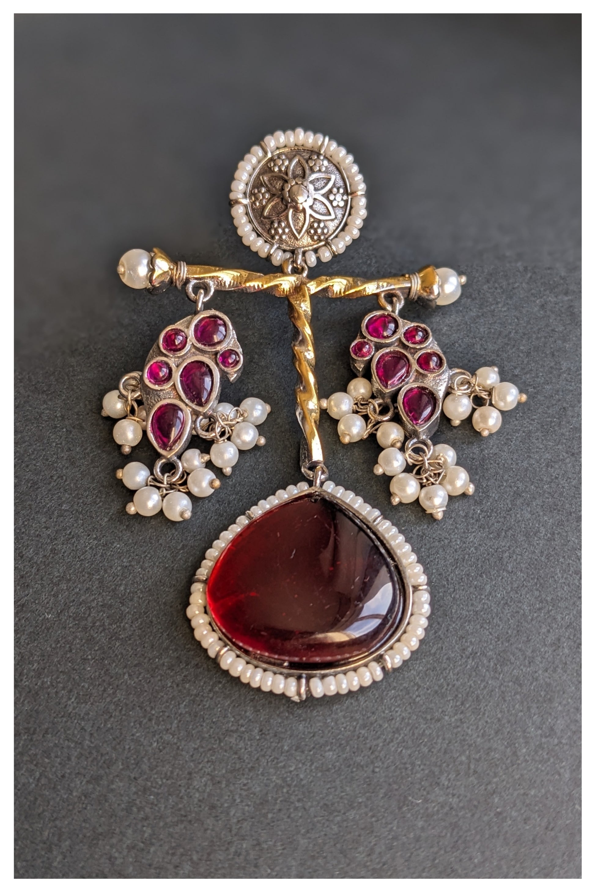 Dual tone dark red long earrings with pearls